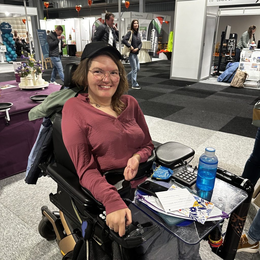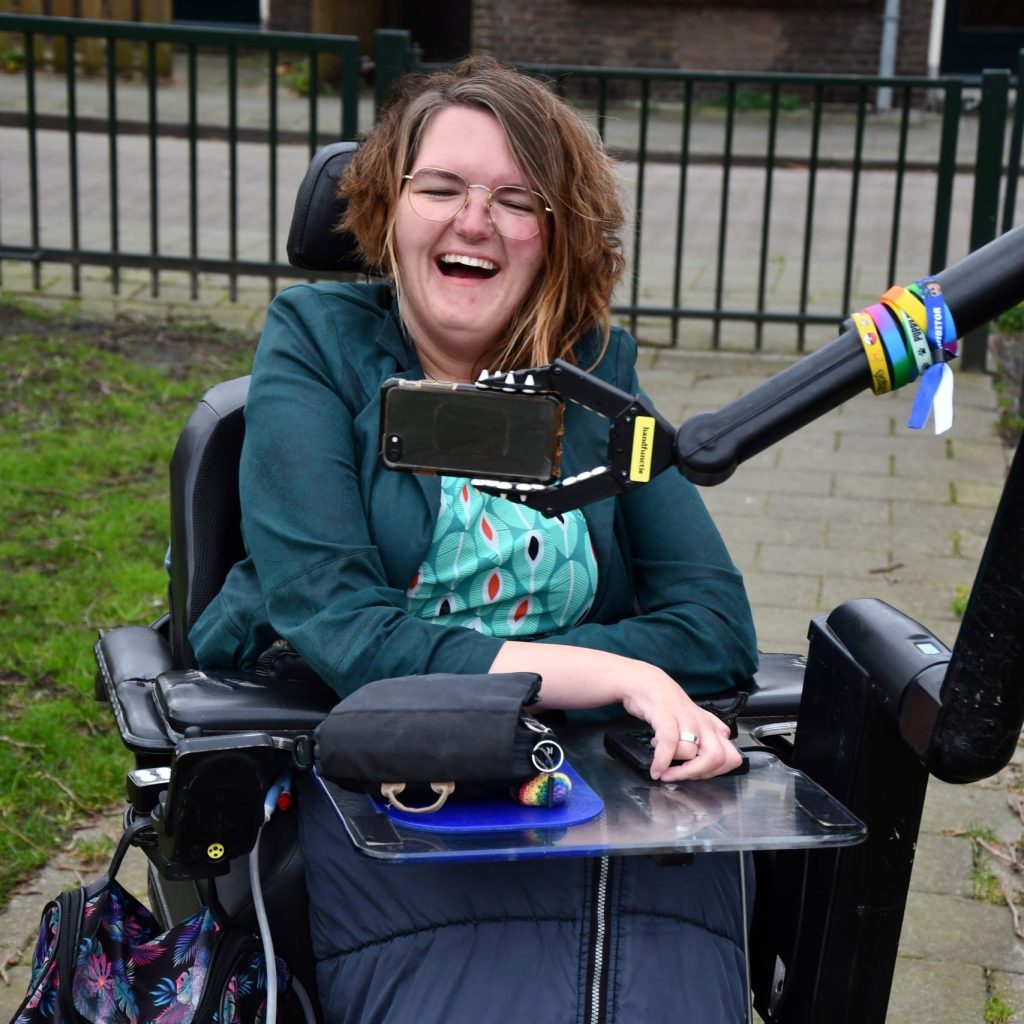 Karin van Dijk (34) is een krachtige persoonlijkheid met een zeldzame spierziekte: DSMARD, een vorm van SMA. Waar spierziekten meestal van buiten naar binnen verzwakken, is het bij haar precies andersom. “Ik heb nul vinger- en polsfunctie. Alle kracht komt uit mijn schouders en ellebogen,” vertelt ze.